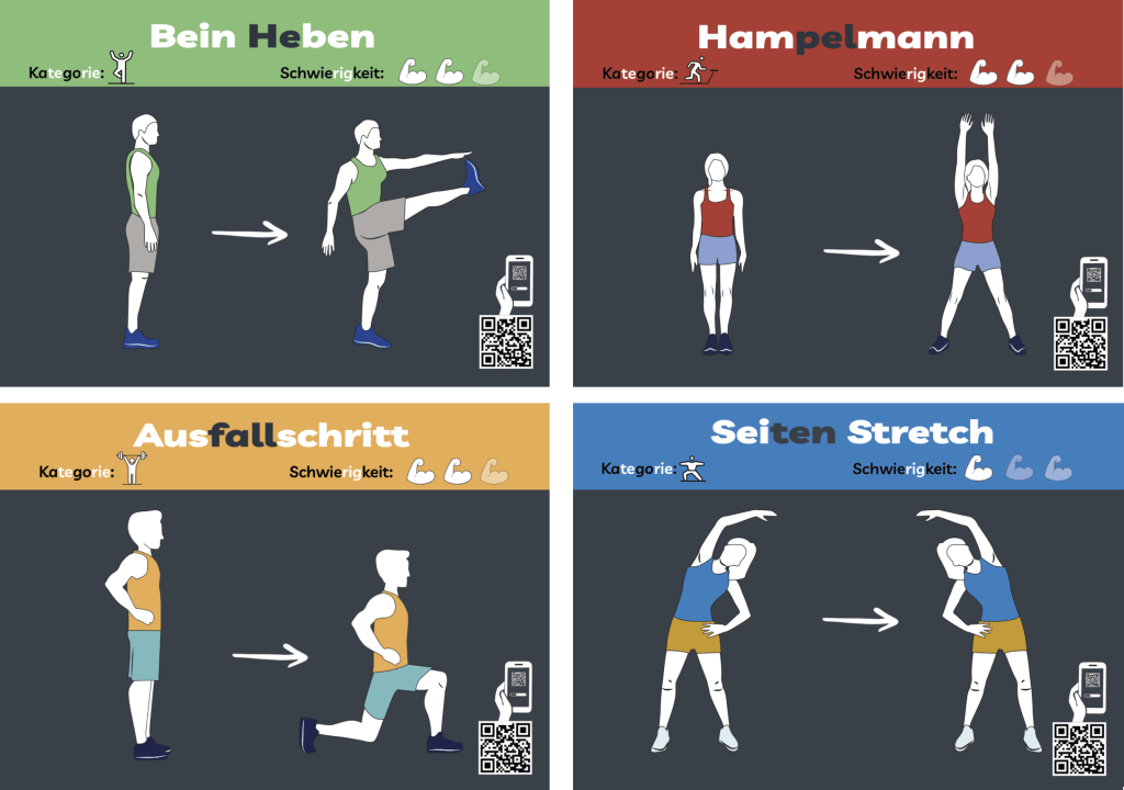 Nach mehreren Iterationszyklen entschieden wir uns für einen multimedialen Ansatz, der illustrative Karten mit einer digitalen Anwendung verbindet. Die Karten zeigen und erklären verschiedene Sportübungen, während die digitale Anwendung zusätzliche Funktionen bietet, beispielsweise das Erstellen von personalisierten Workouts. Denn viele SchülerInnen haben motorische Einschränkungen, die das Bedienen digitaler Interfaces erschweren. Um solchen SchülerInnen die Bedienung der Anwendung zu erleichtern, können diese Übungen mithilfe der Karten auswählen und diese über die digitale Anwendung einscannen, um Übungen auszuwählen und sich Tutorialvideos zu diesen anzuschauen.